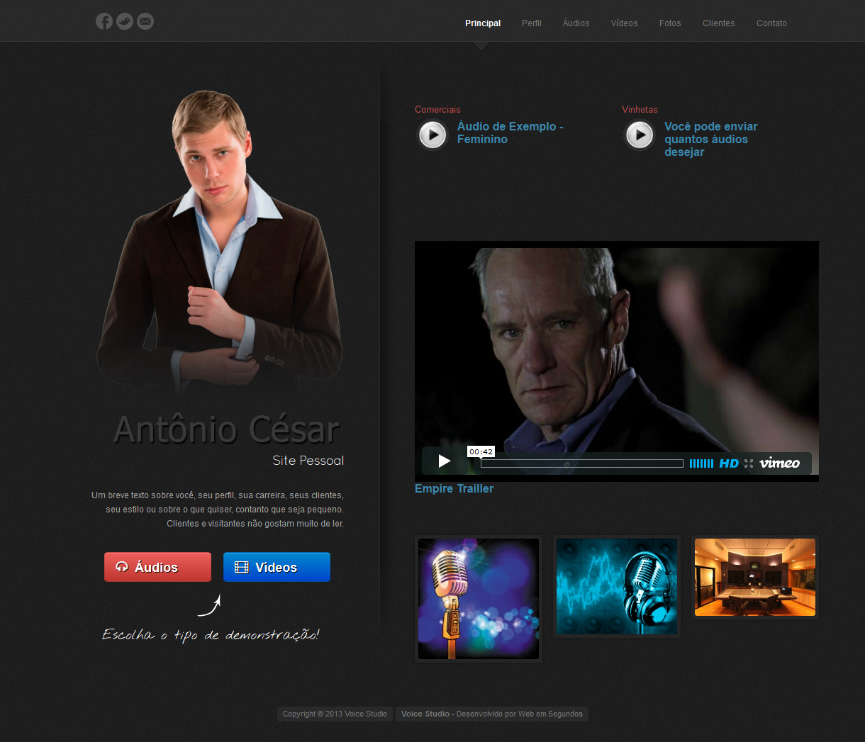 O site conta também com página de biografia, galeria de fotos e uma seção para destacar os principais clientes. Tudo num ambiente fácil de atualizar, onde o próprio locutor faz o gerenciamento do conteúdo.